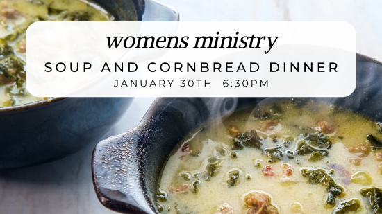Ladies, join us for a time of fellowship and food! We will enjoy some homemade soups and cornbread prepared by our incredible Fellowship Team. We will meet in Room 5 at the church. Please register HERE by January 25th.